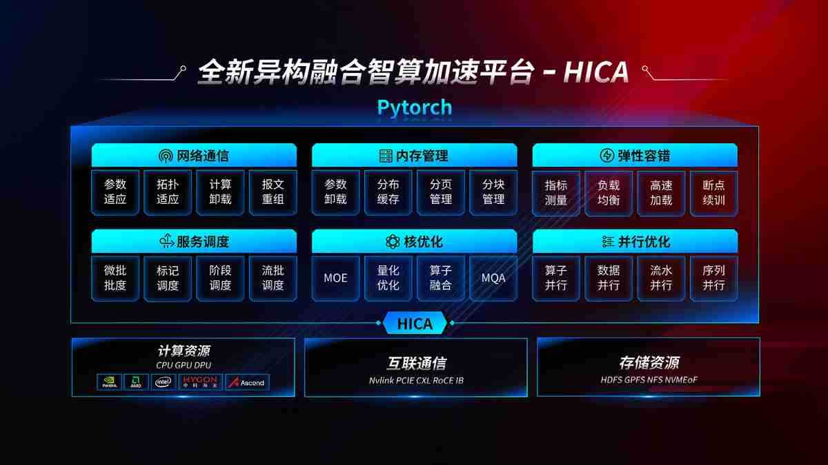 通过自研的服务层、、、、中间适配层、、、、以及调度编排算法,,,,采用数据并行、、模型并行等多种并行方式,,把并行计算任务进行有效的分解,,使其分别由相应的软件栈和算力资源来承接。。当GPU资源变化,,HICA可以实时动态调度计算子任务并调整模型拓扑和架构,,,,以充分聚合各种算力资源。。。