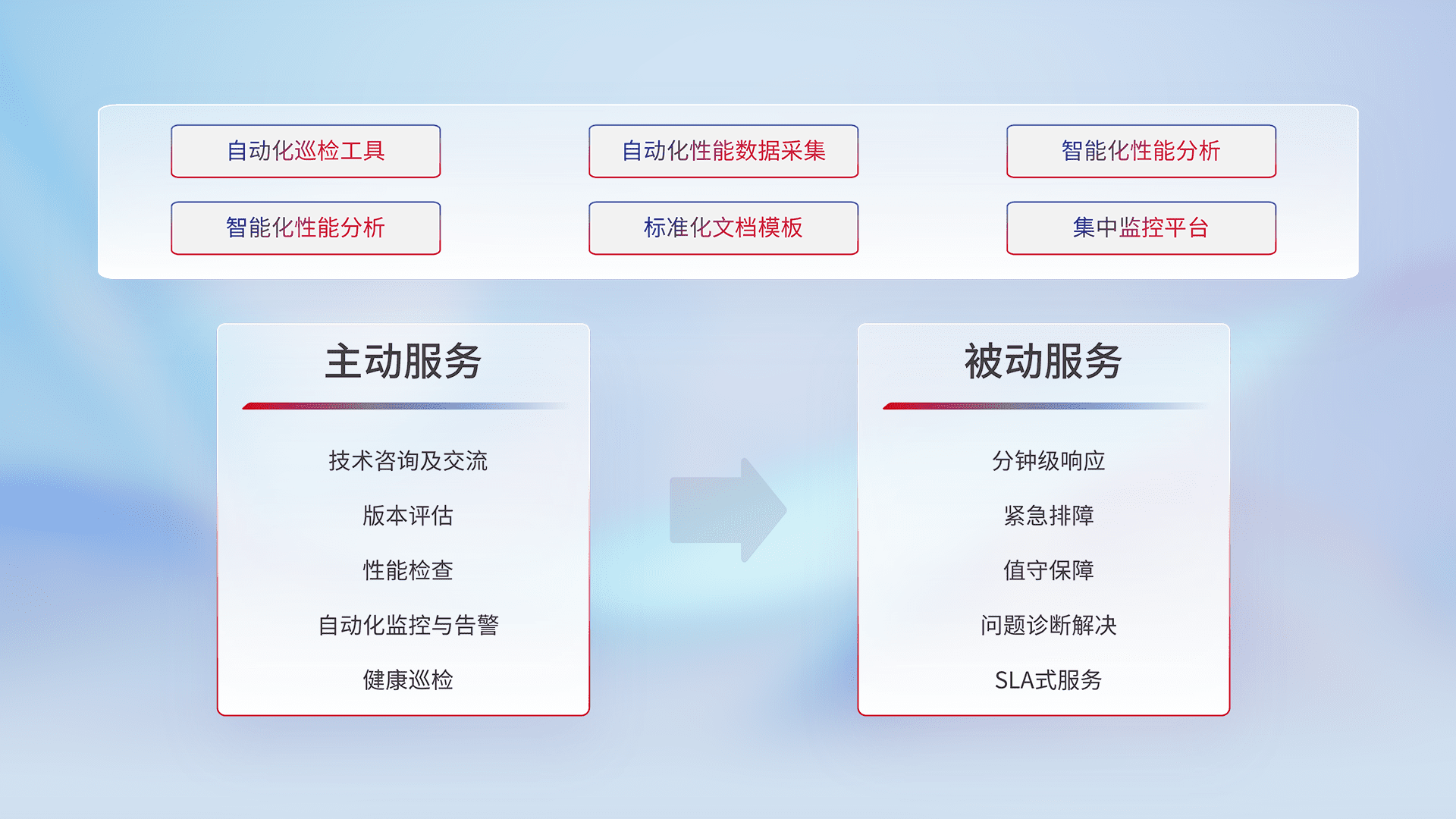 智能化工具和标准化文档,,保障服务质量,,,提供主动服务(包含技术咨询、、、、版本评估、、、、性能检查、、、自动化监控与告警、、健康巡检)和被动服务包含(分钟级响应、、、、紧急排障、、值守保障、、问题诊断解决、、、SLA服务)。。。