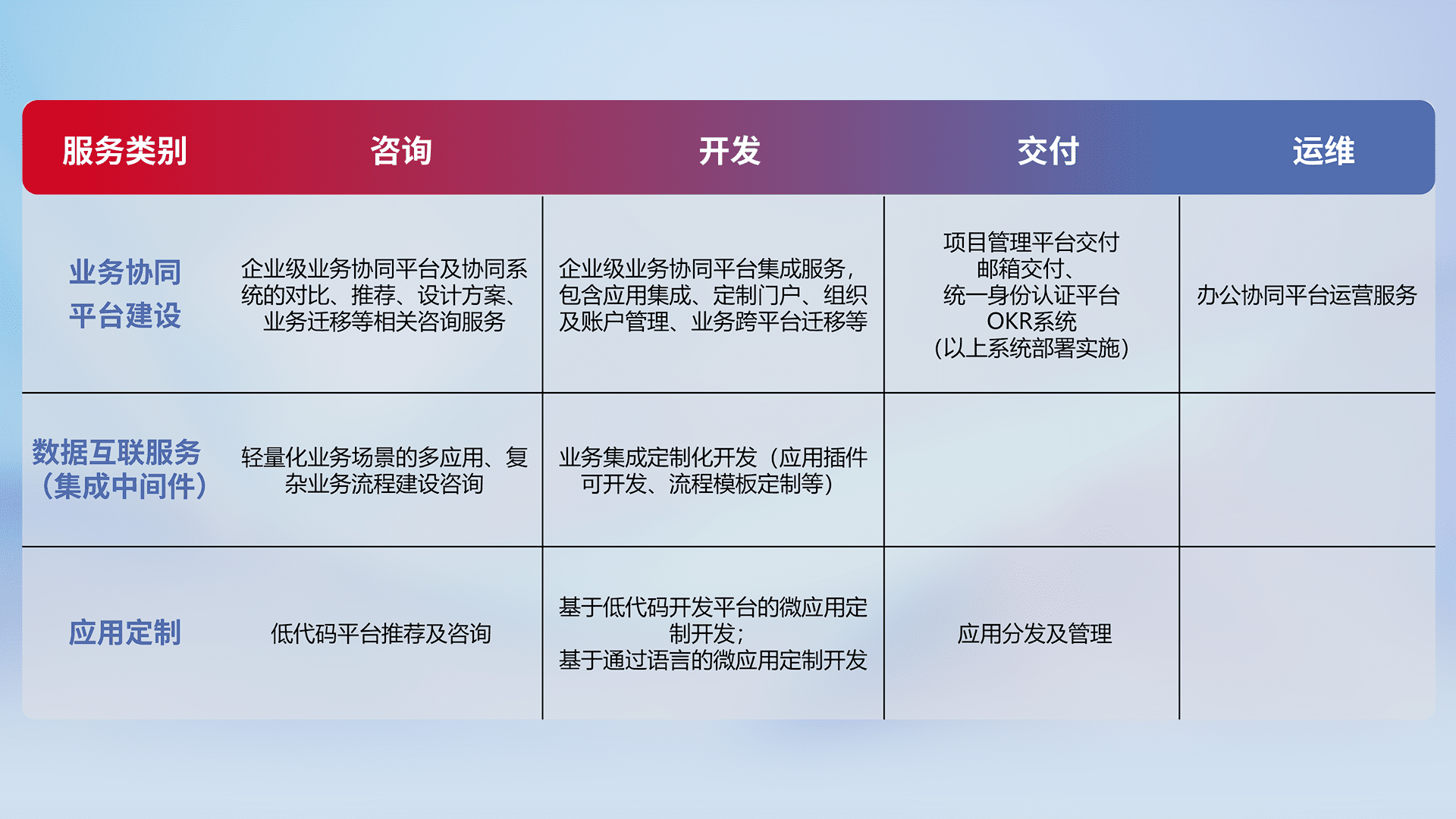 针对钉钉、、、企微、、、IDaas等平台级产品提供产品的规划、、、方案、、、交付、、、、定制化开发等服务,,实现如统一协同办公、、、、智能客户服务、、混合会议管理、、、智能数据查询、、、、等业务场景,,,,实现数字化转型。。。。